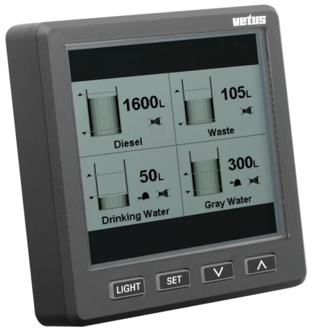 Multi-funktionelt grafisk display til tankniveau-indikering med op til 8 VETUS SENSORB-sonder.