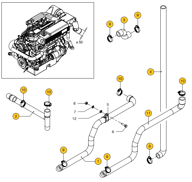 Hoses – cooling system, raw water, sea water pump type 20 Vetus M4.55