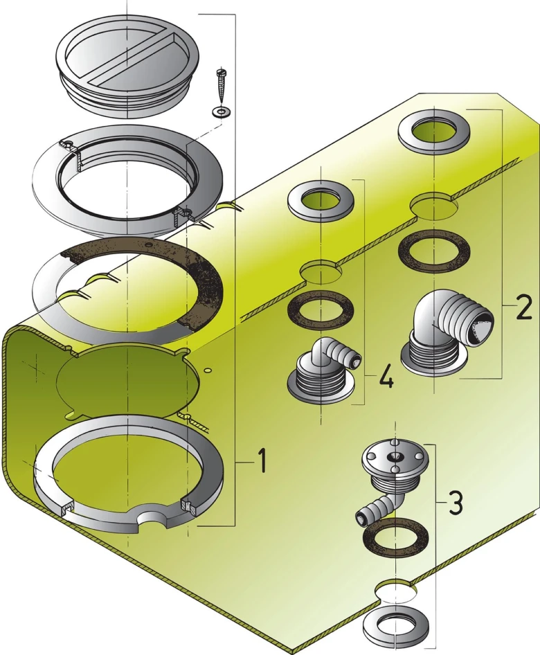 Komplet installationskit til Vetus ferskvandstanke, inklusiv inspektionsluge og diverse slangestuds.