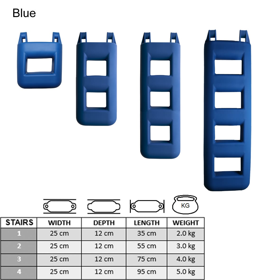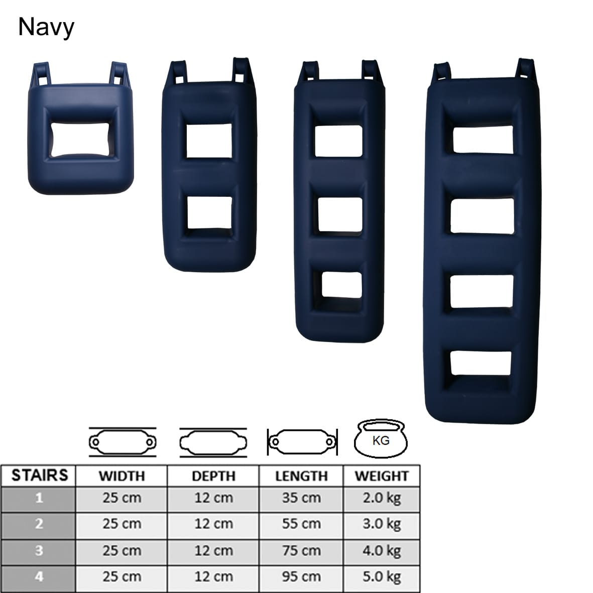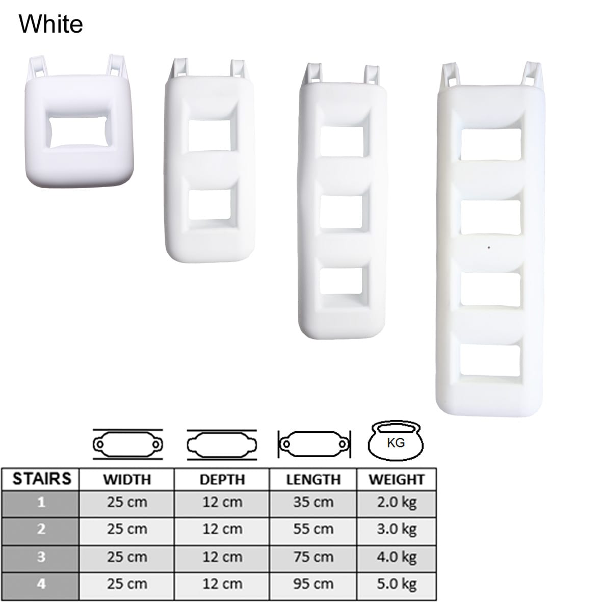 Majoni stigefender fås med 2, 3 eller 4 trin, så du kan vælge den model der passer bedst til din båd og din badeplatform.