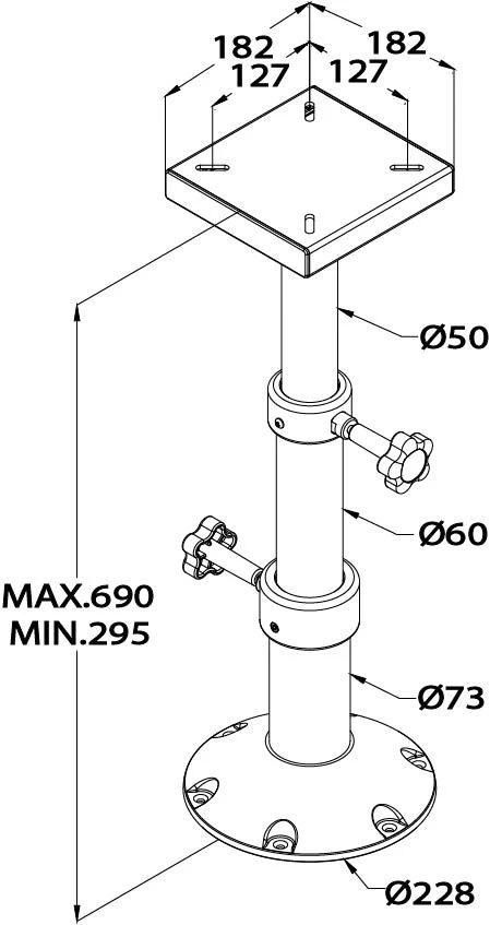 2. Vetus to-trins bordsøjlen er en holdbar og praktisk løsning til bordopsætning ombord. Denne højdejusterbare søjle kan nemt tilpasses i højden fra 290 mm til 690 mm, hvilket gør den ideel til forskellige behov og situationer. Den er fremstillet af anodiseret aluminium, hvilket giver en stærk modstandsdygtighed over for saltvand og barske maritime forhold, hvilket sikrer en lang levetid. Den brede base giver stabil støtte, selv når søjlen er fuldt udtrukket. Bordsøjlen kan bære op til 22 kg i fuldt udtrukket position og op til 102 kg, når den er i laveste position. Dette gør den til et fantastisk valg til både private og kommercielle maritime miljøer. Gør din bordopsætning mere fleksibel og stabil med denne pålidelige bordsøjle.