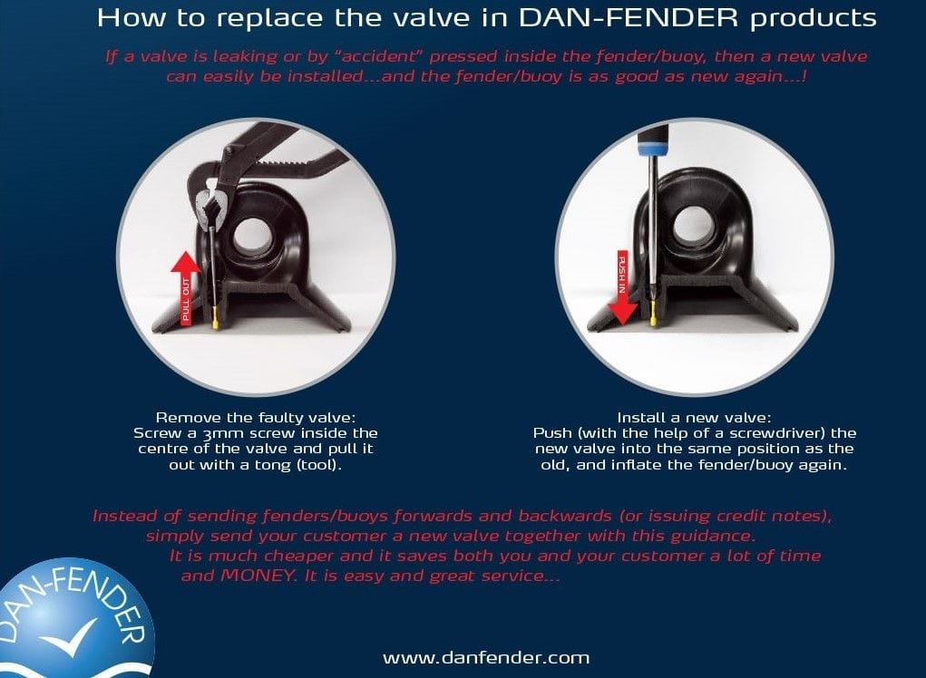 Danfender anvender ventilsystemer i høj kvalitet, og de fleste små og mellemstore fendere samt bøjer er udstyret med en udskiftelig metalventil. Det betyder, at en defekt ventil ikke kræver udskiftning af hele fenderen – du kan blot montere en ny ventil.