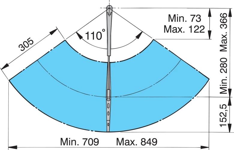 Armlængden kan nemt justeres fra 280 til 366 mm, hvilket giver dig mulighed for at tilpasse visningsområdet efter dine behov. Motoren har automatisk stop, en enkelt hastighed og mulighed for at indstille viskevinklen til enten 80º eller 110º, hvilket giver dig fleksibilitet i forskellige vejrforhold.